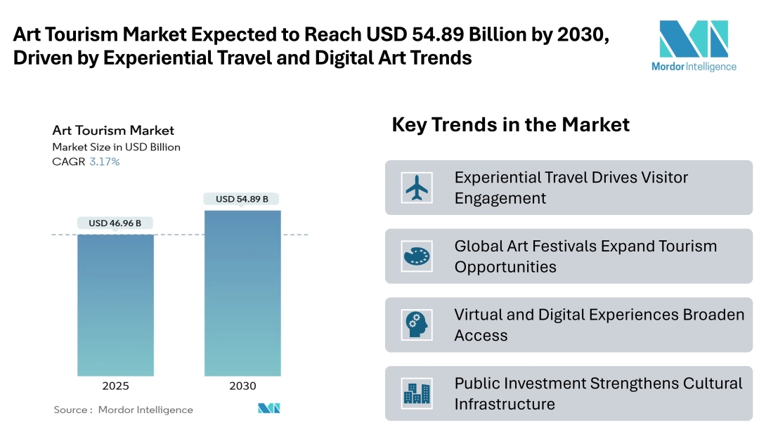 According to Mordor Intelligence, the art tourism market size reached USD 46.96 billion in 2025 and is forecast to expand to USD 54.89 billion by 2030, reflecting a 3.17% CAGR. This growth is driven by rising interest in immersive cultural experiences and supportive government policies. As travelers seek meaningful cultural engagements, art tourism is becoming a significant segment within the broader travel and tourism industry.