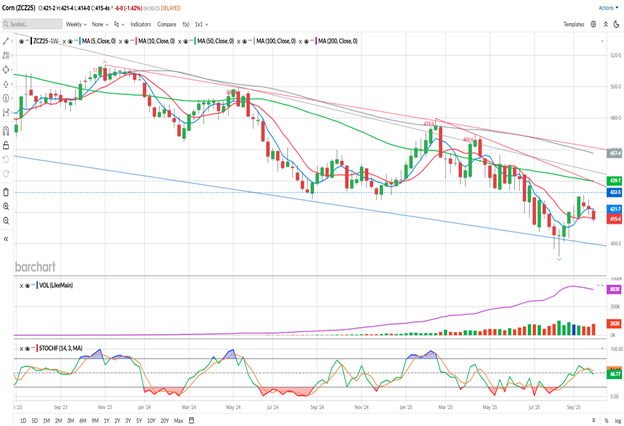 Can Corn prices go lower? Absolutely. We’re in the process of harvesting a record crop. If yields improve (or don’t worsen) through the duration, $4.00 or lower is certainly within expectations. That $4.00 mark is a nice big, fat, round even number and may offer support, should we get there. If that can’t hold, the August 12th low of 3.92 might be in play. Also, recall that last year (2024) this market made it’s high at 4.59 ¾ on Oct 2nd, before dropping 26 ½ cents to the low of October 17th. So yes, the market can go lower. And recent trade activity may be the beginning of a new downward push. The last time the market interacted with the 100-day moving average was over 5 days this past April. And at that time, we saw Corn go from 4.69 ½ all the way down to 3.92 on August 12th.