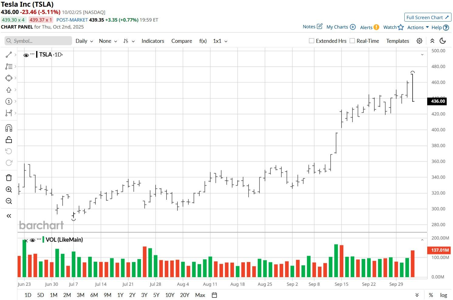 As Elon Musk’s net worth surpasses the historic $500 billion mark, Tesla (TSLA) shares’ trajectory appears poised for continued momentum, according to options data from Barchart.