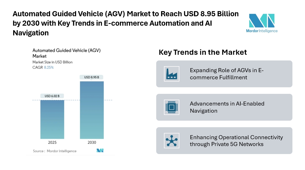 According to Mordor Intelligence, the automated guided vehicle market size reached USD 6.02 billion in 2025 and is forecast to expand to USD 8.95 billion by 2030, reflecting an 8.25% CAGR. The increasing adoption of autonomous mobile fleets across industries is also contributing to the expanding Automated Guided Vehicle Market share.