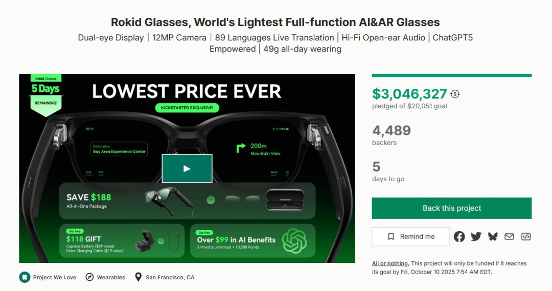 Rokid, a pioneer in human-computer interaction and augmented reality, announced that its Rokid Glasses have officially raised over $3 million through crowdfunding on Kickstarter. This milestone positions Rokid among the top-performing wearable technology campaigns in the platform’s history, marking a significant step forward in the evolution of everyday AI-powered eyewear.
