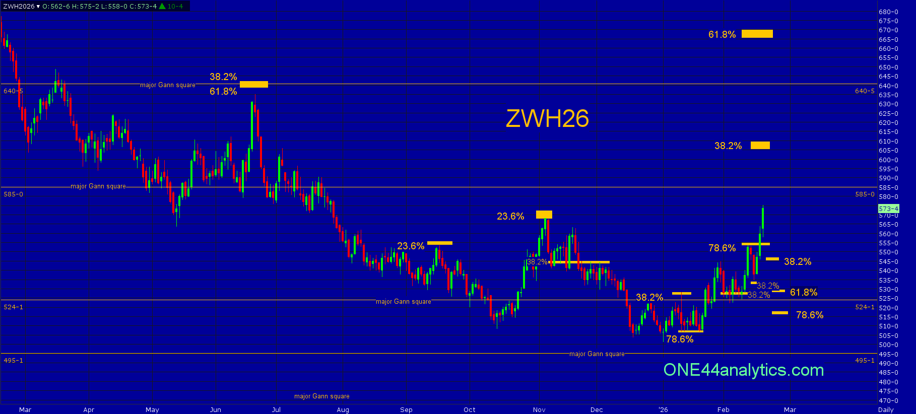 Above it, the short term target is the 585.00 major Gann square. The long term target is also the long term swing point at 606.00, this is 38.2% on the continuation chart.
