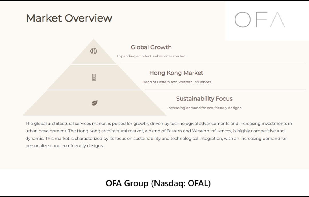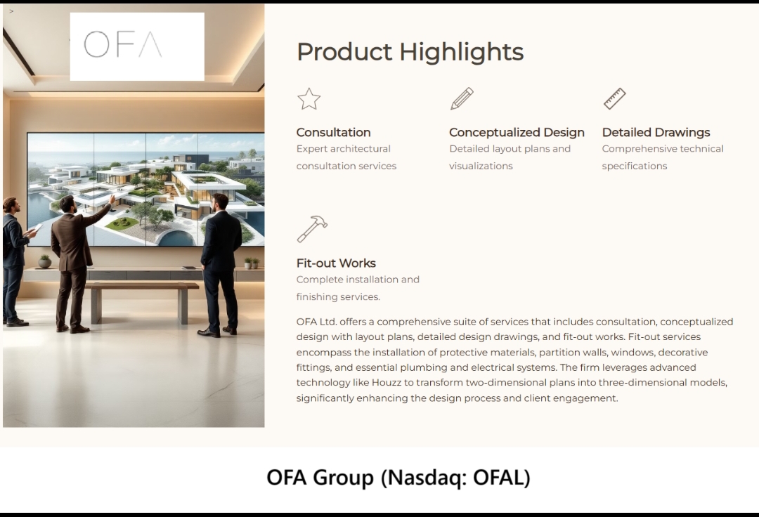 OFA Group, (Nasdaq: OFAL) through its wholly owned operating subsidiary, Office for Fine Architecture Limited, provides comprehensive architectural services, including design and fit out services for commercial and residential buildings. The OFAL mission is to leverage its expertise in architectural design to maximize the potential of every property, ensuring that its unique attributes are highlighted and enhanced.