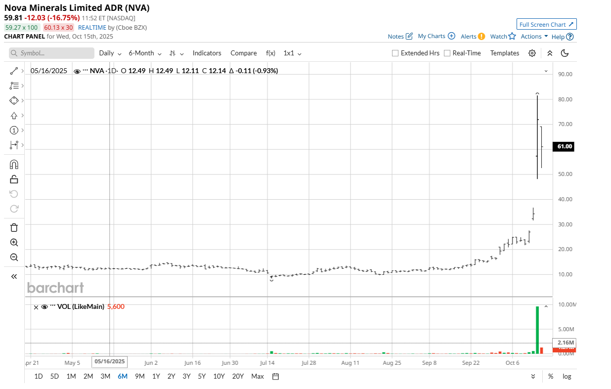 Nova Minerals (NVA) shares soared over 110% on Tuesday, Oct. 14 following news that President Donald Trump’s administration has taken an interest in the company’s Alaska mining project.