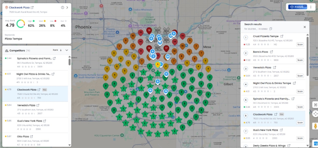 Location-Based Competitor Lists: Click any grid point to see a full list of businesses ranking in that specific area.