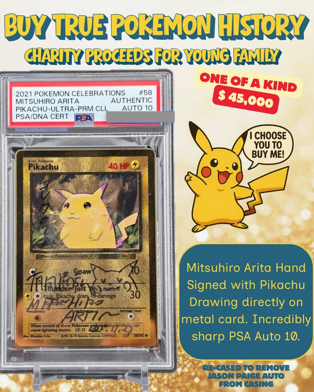 ThePokeCard.com lists a one-of-a-kind gold-plated Pikachu card, signed and illustrated by Mitsuhiro Arita, to benefit a family facing Parkinson’s Plus.