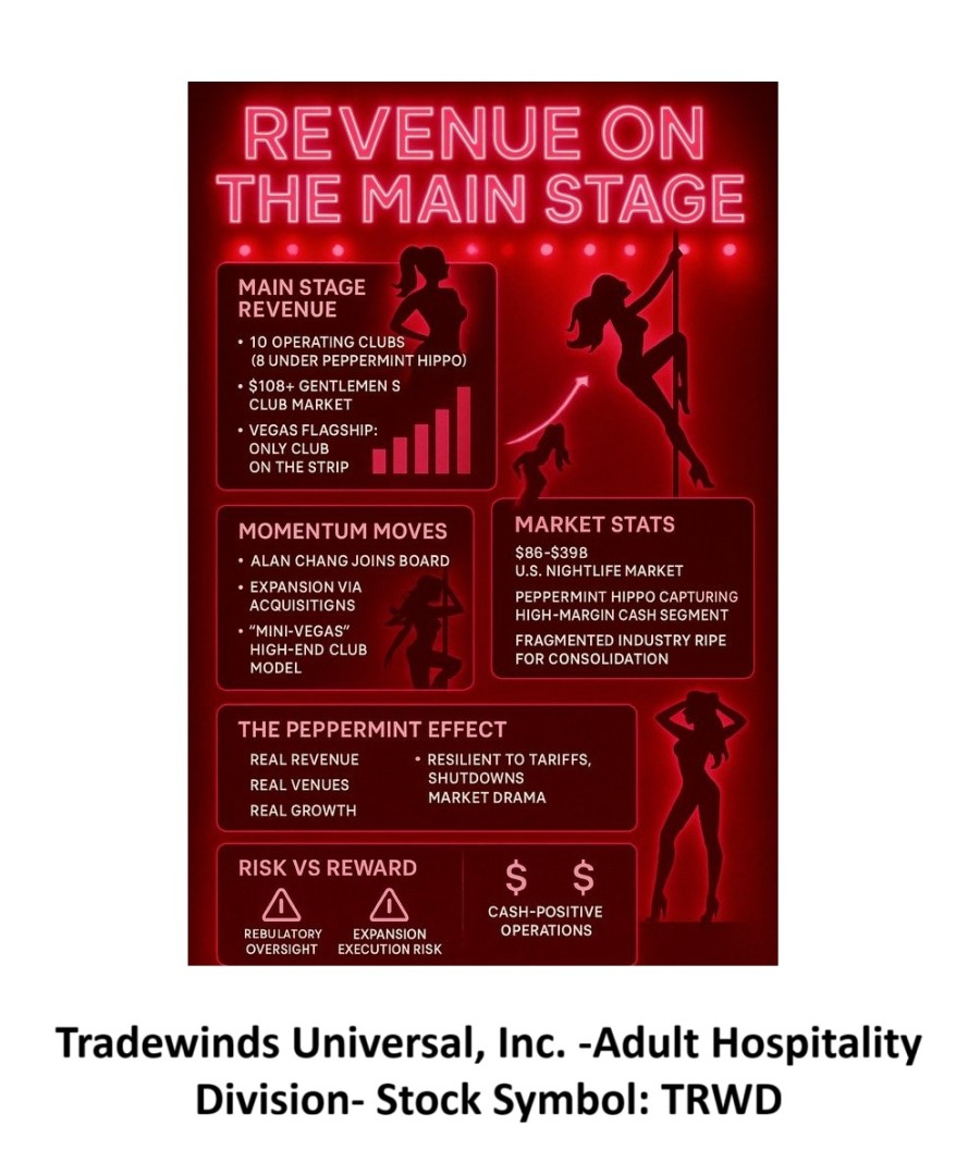 Upon finalization, the Adult Hospitality Division will operate as a wholly owned business unit under TRWD, incorporating Peppermint Hippo and additional affiliated brands. This structure is designed to form a consolidated national conglomerate of modernized clubs, creating one of the only publicly traded platforms within the adult hospitality and nightlife sector.