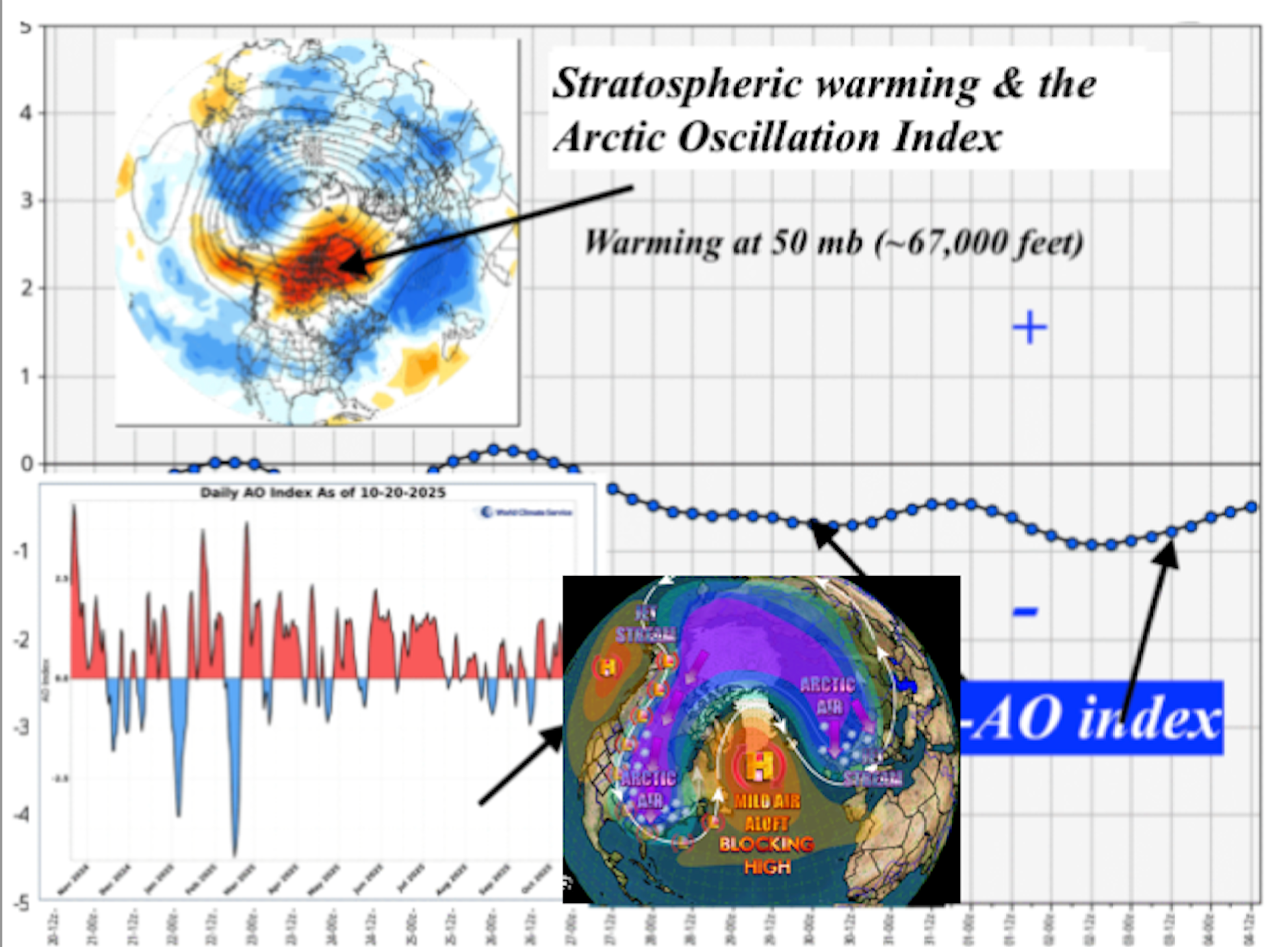 This intense storm was partly responsible for warming up northern Canada and creating what we call a stratospheric warming event at 65,000 feet. This in turn will bring a negative Arctic Oscillation Index in November (-AO).