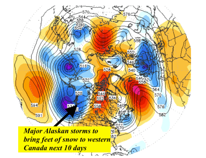 You can see the effects of Ex-Typhoon Halong and the continuation of cold, stormy weather for the next 10 days over Alaska (blue).Â