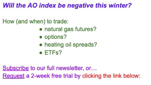 Natural gas traders are watching very closely for any signs of the Arctic Oscillation Index (AO) remaining negative for November and December. If so, a cold early winter will ensue and natural gas prices will soar later.Â