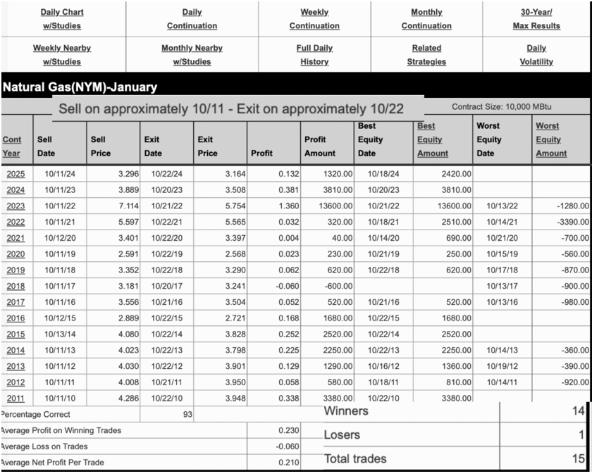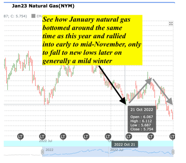 Initially, natural gas prices first rallied in early October due to residual strong late summer demand and several bullish EIA numbers. However, I stuck to my guns that 90% of the time,natural gas prices go lower when October is warm. However, notice that this bearish seasonal tendency often ends around October 22. This is especially true if forecasts change towards colder weather for November.