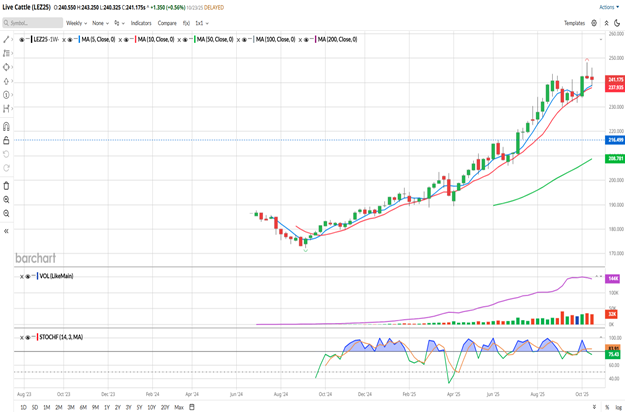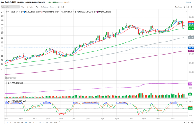 Today, the December Live Cattle futures closed at 241.175, up 1.350 on the day. A positive close following yesterday’s drop of 5.600. The market did close well off the highs of the day, however, which may indicate more selling pressure ahead. The 5- and 10-day moving averages (blue and red) made a bearish crossover yesterday and today’s trade did seem to find some resistance near that 5-day average (242.380 at the close) Live Cattle began their drop last Friday (after closing at new contract highs on Thursday) when President Trump started talking about doing something to bring the price of beef down on Thursday afternoon or evening. This week started on a bullish note, with Monday and Tuesday seeing gains, but unable to break out of Friday’s trading range.