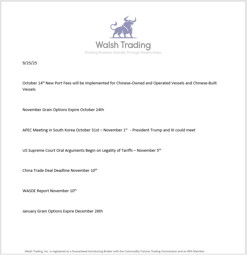 The Grain Markets were all much higher and lead by the Beans today. January'26 Soybeans were 12 cents higher today and settled at 1062. Today's high was 1062 ¼ and that is the new 1-month high as well. Today's low was 1049 ¾ and the 1-month low is 10.12 ½. Since 9/23 January'26 Soybeans are 30 ¼ cents higher or almost 3%. December'25 Corn looked good and set a new monthly high today. December'25 Corn was 5 cents higher today and settled at 428. Today's high was 428 ½ and that is the new 1-month high as well. Today's low was 421 and the 1-month low is 409 ¼. Since 9/23 December'25 Corn is 1 ¾ cents higher or about ½ %. The Wheat looked great as well. December'25 Wheat was 9 ¼ cents higher today and settled at 513. Today's high was 513 ½ and the 1-month high is 527 ¾. Today's low was 502 ½ and the 1-month and contract low is 492 ¼. Since 9/23 December'25 Wheat is 7 ½ cents lower or more than 1%. President Trump will be meeting with XI one week from today. The anticipation of a Trade Deal with China has put some premium back into the Grain Markets. The Grains all looked good today with the December'25 Corn making a new 1-month high and closing just ½ a cent off the high. The December'25 Wheat also closed just ½ a cent below the high of the day. The January'26 Soybeans made a new 1-month high, settled 10 cents higher, and just a ¼ of a cent below today's high. The Soybeans and the Soybean Oil could trade substantially higher if a trade deal is made with China and India. The Bean Oil has its own upside potential as well and could be the best contract to be long for the next six months. I feel the demand for Soybean Oil will remain strong. There is a Soybean Oil Trade below and it is Selling a July'26 Bean Oil Put Spread and Buying a May'26 Call Spread. Take a look and let me know if you have any questions. The contract high in January'26 Soybeans is 1087, just 25 cents away from today close. Have a great night.