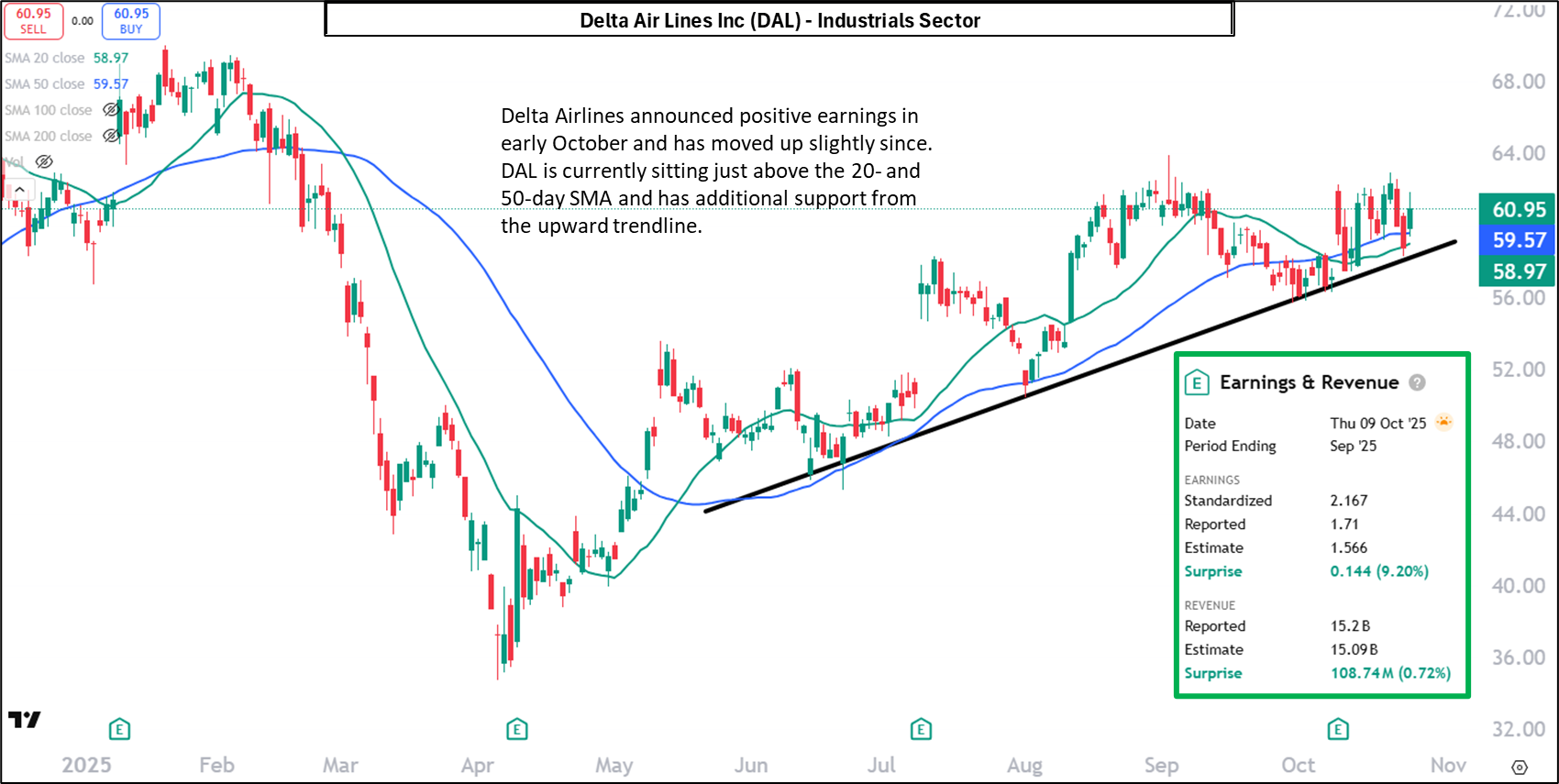 Delta Airlines announced positive earnings in early October and has moved up slightly since. DAL is currently sitting just above the 20- and 50-day SMA and has additional support from the upward trendline.