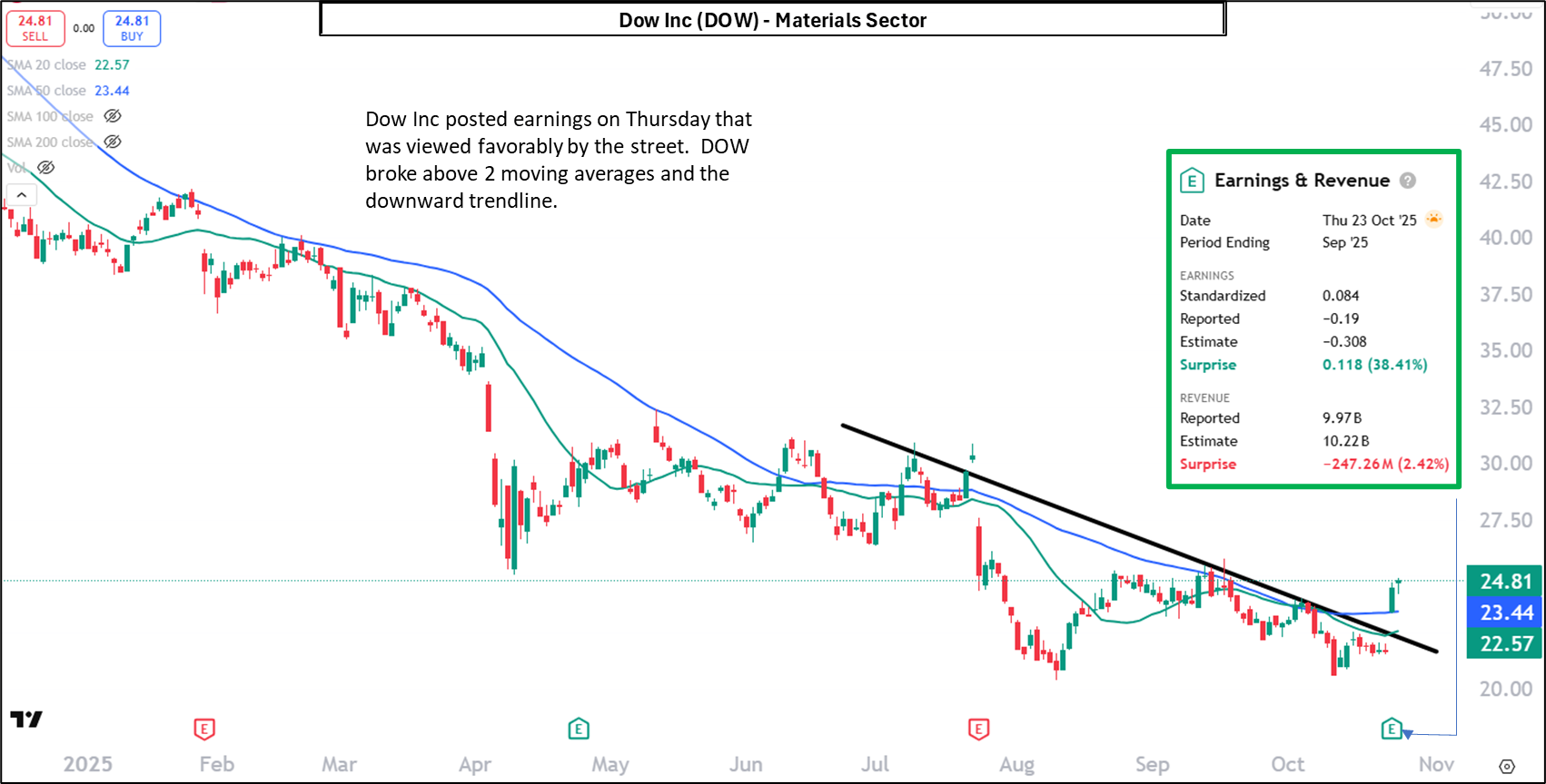 Dow Inc. posted earnings on Thursday that was viewed favorably by the street. DOW broke above 2 moving averages and the downward trendline.