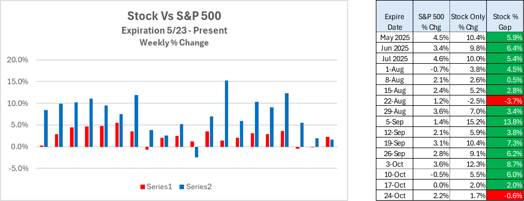 Each week the Newsletter contains around 20 stocks / ETF's on the Watch List to be opened the following Monday for expiration 4 Fridays later. Since the expiration cycle on May 23, the average stock gain on the Watch List has outperformed the S&P 500 21 of 23 weeks. The average Watch List to S&P 500 ratio currently sits at 2.55 : 1 in favor of the Watch List.