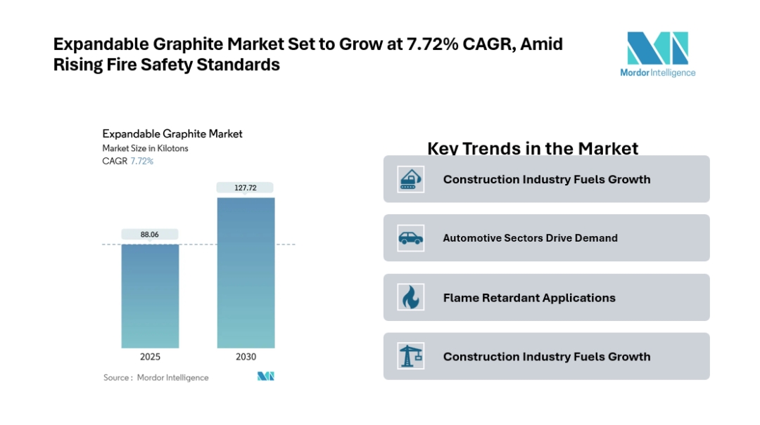 The global expandable graphite market is projected to grow from 88.06 kilotons in 2025 to 127.72 kilotons by 2030, registering a compound annual growth rate (CAGR) of 7.72%. This growth reflects a steady shift across industries toward materials that offer fire resistance, thermal stability, and environmental safety.