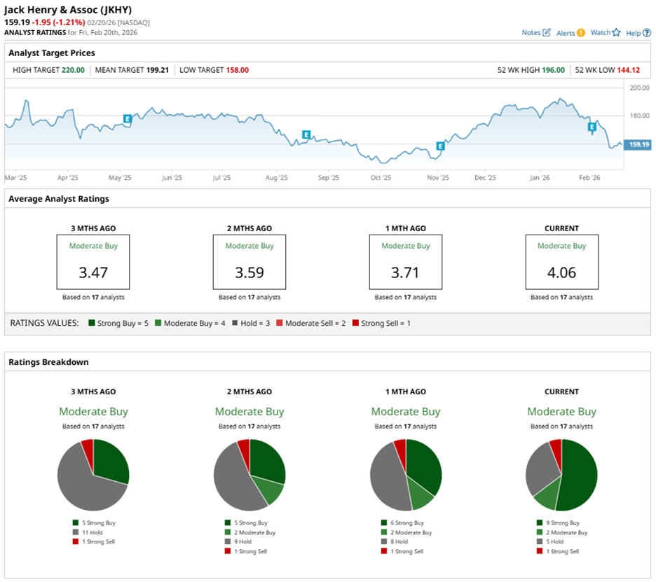 Wall Street currently assigns JKHY stock an overall rating of “Moderate Buy.” Among 17 analysts covering the stock, nine recommend “Strong Buy,” two suggest “Moderate Buy,” five advise “Hold,” while one has flagged a “Strong Sell.”