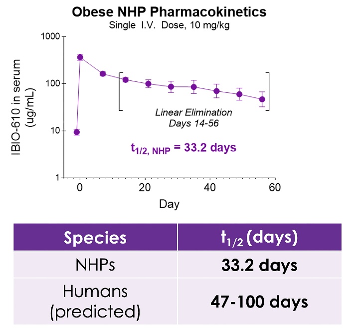 The pharmacokinetic data, to be presented at ObesityWeek, demonstrates IBIO-610 has an extended half-life in obese non-human primates of 33.2 days. Based on an allomeric scaling model of half-life extended antibodies1,2, it is predicted IBIO-610 will have a half-life in humans of up to 100 days, reducing the dosing frequency to once every six months, which has the potential to significantly improve patient experience.