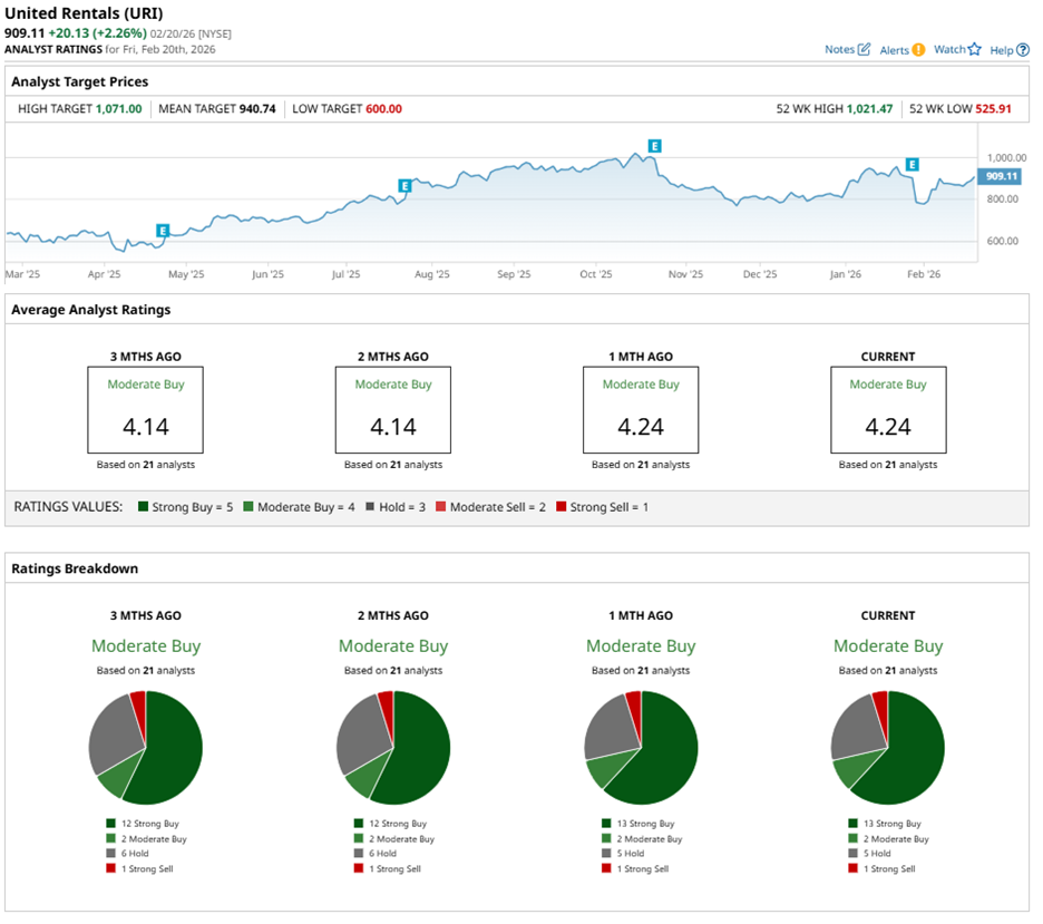 Wall Street nevertheless maintains a favorable stance. Analysts have assigned URI stock an overall “Moderate Buy” rating. Of 21 analysts covering the stock, 13 recommend “Strong Buy,” two suggest “Moderate Buy,” five advise “Hold,” and one issues a “Strong Sell.”