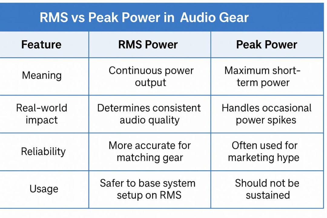 RMS vs. peak: Look for continuous (RMS) power per channel at a realistic impedance (e.g., 8Ω or 6Ω) rather than marketing peak wattage. RMS tells you how loud and clean your AVR can play for extended periods.
