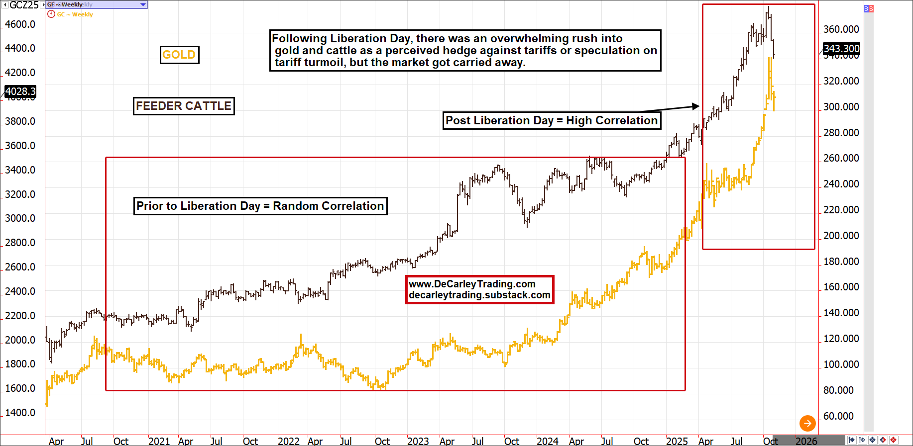 We know a substantial chunk of the cattle rally was driven by speculation because we could see it in market correlations. When correlations become extreme, it is a sign of algorithmic trading or outright bandwagon speculation. We are in an era in which the system is flush with cash, and market participants are buying assets that are rising without regard for fundamentals or risk. Over the last 180 trading days (roughly 9 months), gold and cattle have settled in the same direction about 85% of the time. In the beginning, these assets were bought as a perceived hedge against tariff turmoil, but eventually became indistinguishable from meme stocks.