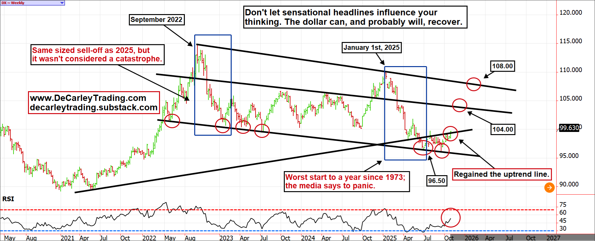Last week, we shared the monthly version of the dollar index chart, so we opted for the weekly bar view this week. Despite sensational headlines disparaging the US dollar, it isn’t behaving any worse than it did during the September 2022 sell-off. The 2025 selling just happened to start at the turn of the year to make the stats seem more dire; for instance, the media made sure we were all aware that this was the worst start to a year since 1973. Admittedly, that is a scary thought. Yet, the US currency has been methodically basing and appears to be breaking back above its previous support line. This looks like a currency that wants to regain its composure. If so, there will be consequences to other assets that have benefited from the lower dollar, such as cattle.