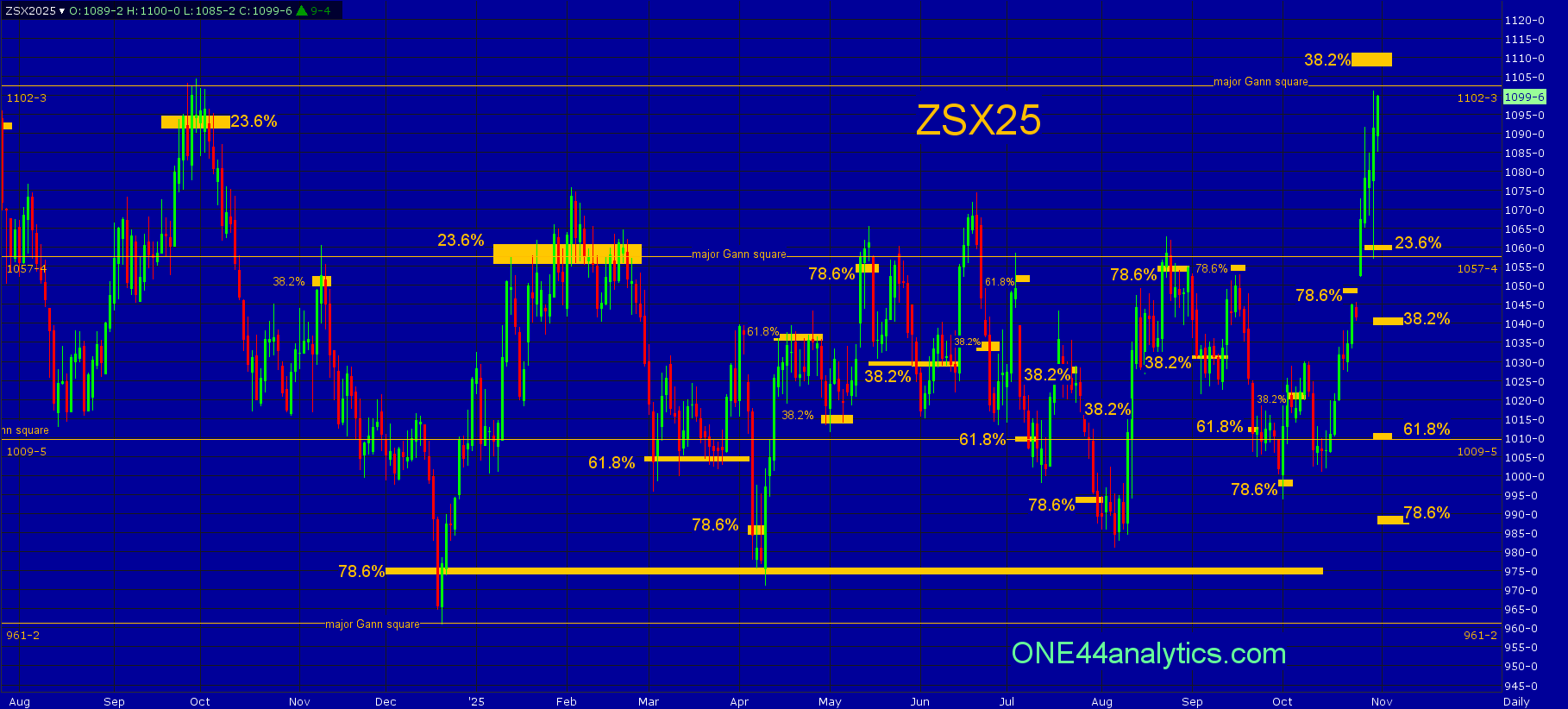Below it, the strongest sign would be that it stays above the 1057.50 major Gann square. With the breakout we can now retrace back to the 12/19/24 low to see if this rally will continue. Giving the 1057.50 level extra support is 23.6% back to that low is 1060.00, following the ONE44 23.6% rule we know extremely strong markets will only retrace 23.6%. The short term...