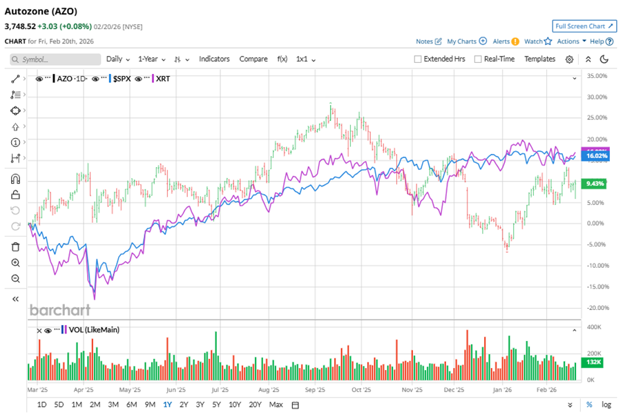 Shares of this auto parts retailer have underperformed the broader market over the past year. AZO has gained 10% over this time frame, while the broader S&P 500 Index ($SPX) has rallied nearly 13%. However, in 2026, AZO stock is up 10.5%, surpassing the SPX’s marginal rise on a YTD basis.