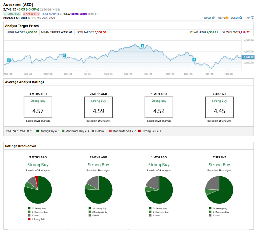 On Feb. 20, Citigroup Inc. (C) analyst Steven Zaccone reiterated a “Buy” rating on AZO and set a price target of $4,200, implying a potential upside of 12% from current levels.