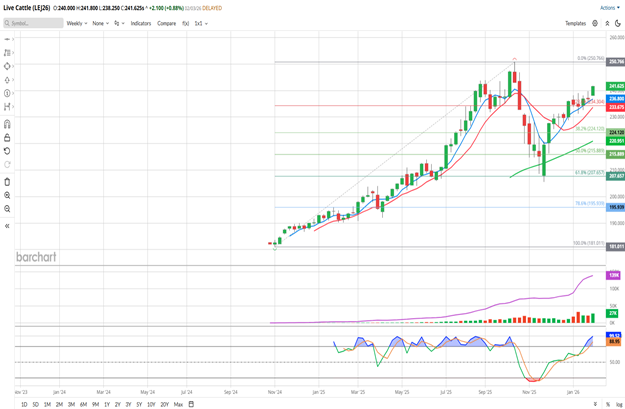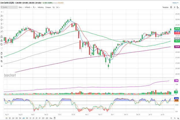 Looking at the chart above, you might notice that the 5- and 10-day moving averages made a bullish crossover on January 28th. The 5-day (blue) is at 238.790 and the 10-day (red) is at 237.605 are both below the market and pointing higher. The 100-day average (grey) is at 232.260 or so, and is also (barely) inclined toward higher prices. The remaining averages on the chart, the 50- and 200-day (green/purple, respectively) are well below the market and also pointing upward. Stochastics (bottom sub-graph) have ticked back up into an overbought condition, but I don’t see that as concerning. It certainly appears on this 6-month view that Live Cattle prices have had no problem (and perhaps a preference) to being overbought, rather than oversold.