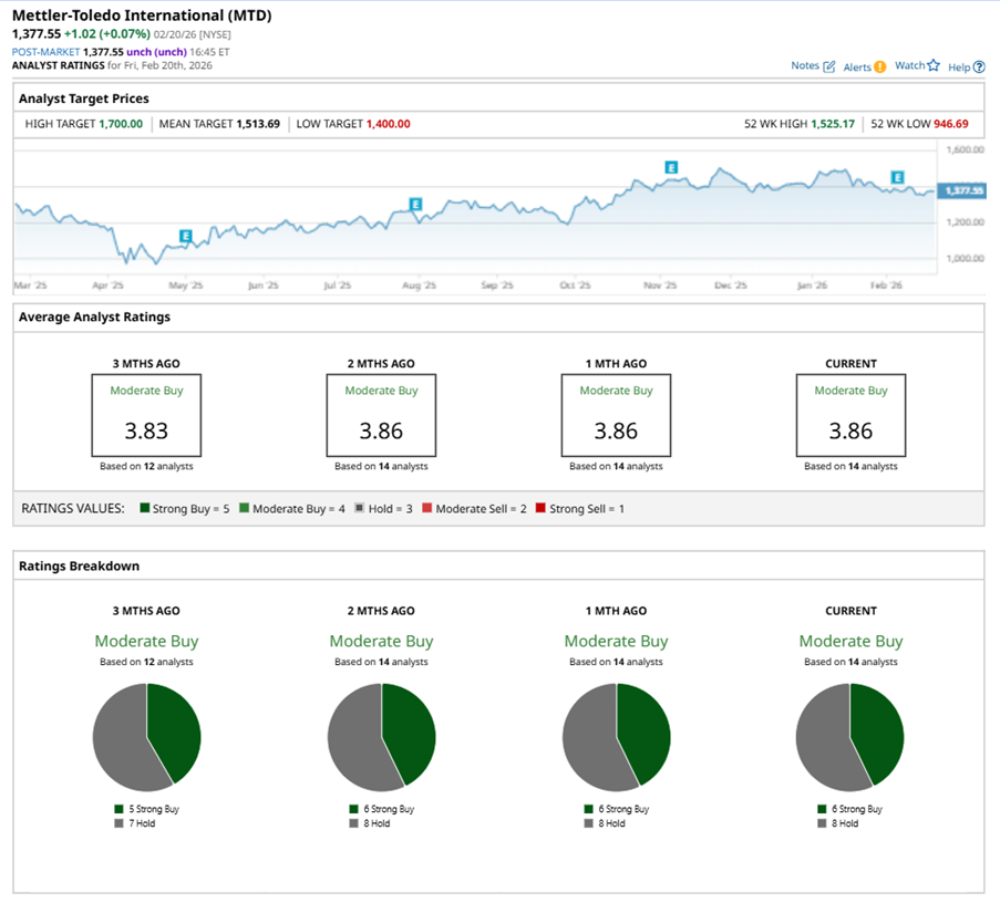 On Feb. 10, Morgan Stanley (MS) analyst Kallum Titchmarsh maintained a “Hold” rating on MTD and set a price target of $1,475, implying a potential upside of 7.1% from current levels.