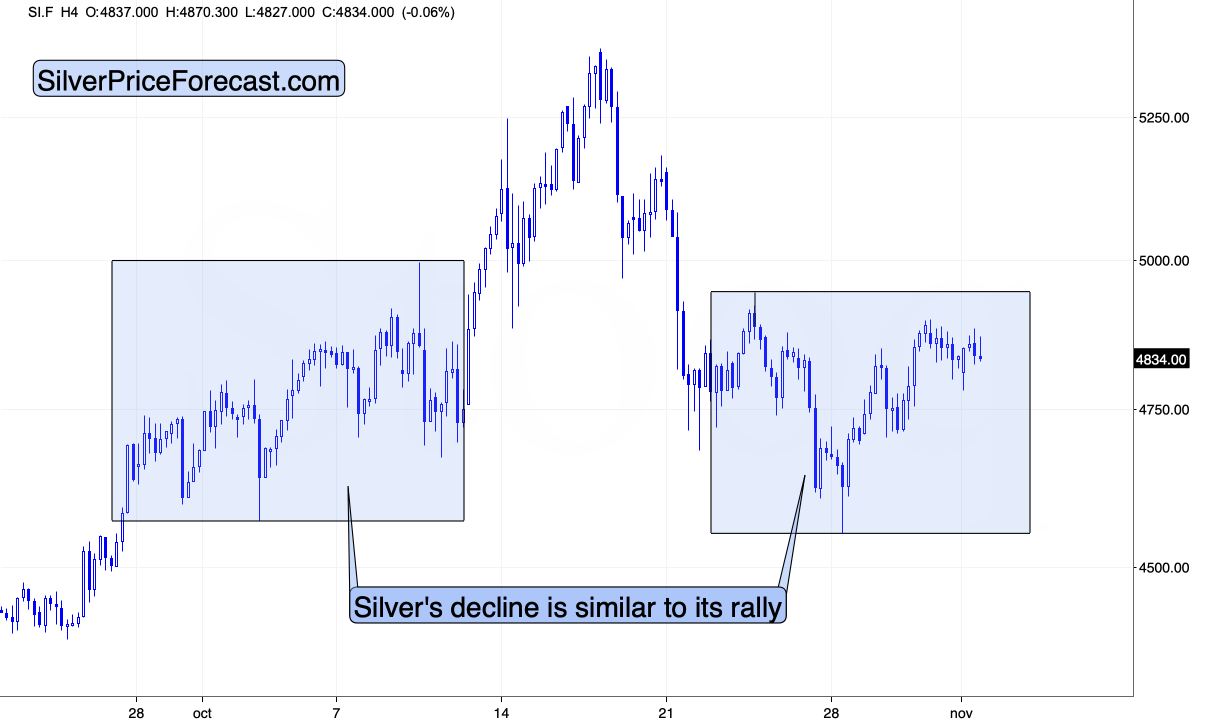Silver is also correcting its recent decline, and it’s doing so in a way that’s creating a symmetrical pattern relative to how its price moved in early part of October.Â