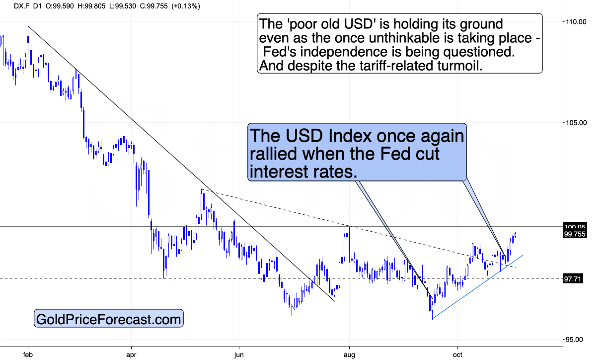 Still, once the USD Index’s rally becomes obvious, gold price is likely to tumble. I already wrote why gold price prediction for November 2025 was bearish previously, and what we see today simply confirms it.