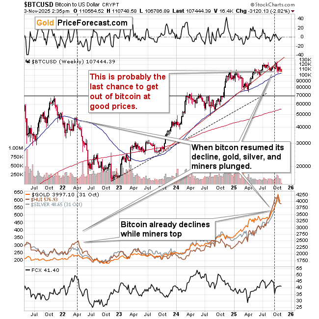 Yes. The ‘new gold’ broke below its rising support line, and it verified this breakdown by moving back to this line and then moving lower once again. At the same time, bitcoin invalidated its move to new highs.