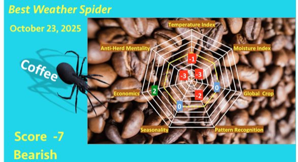 Our Weather Spider helps traders gauge the potential market direction. While we have been longer term bearish coffee, in the short term tight stocks of coffee and a typhoon hitting Vietnam may keep this market in a bull trend. Also, the market is waiting to hear new news about any Trade Tariff agreements, or not.