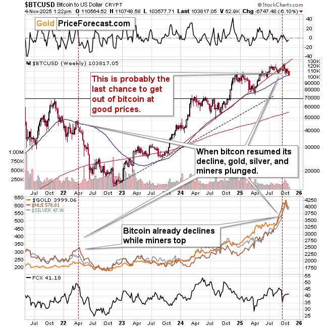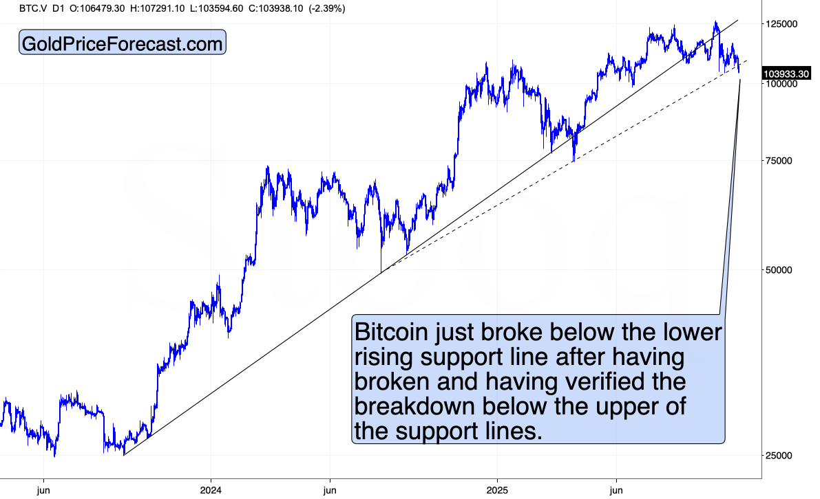 Yes. The ‘new gold’ broke below its rising support line, and it verified this breakdown by moving back to this line and then moving lower once again. At the same time, bitcoin invalidated its move to new highs.
