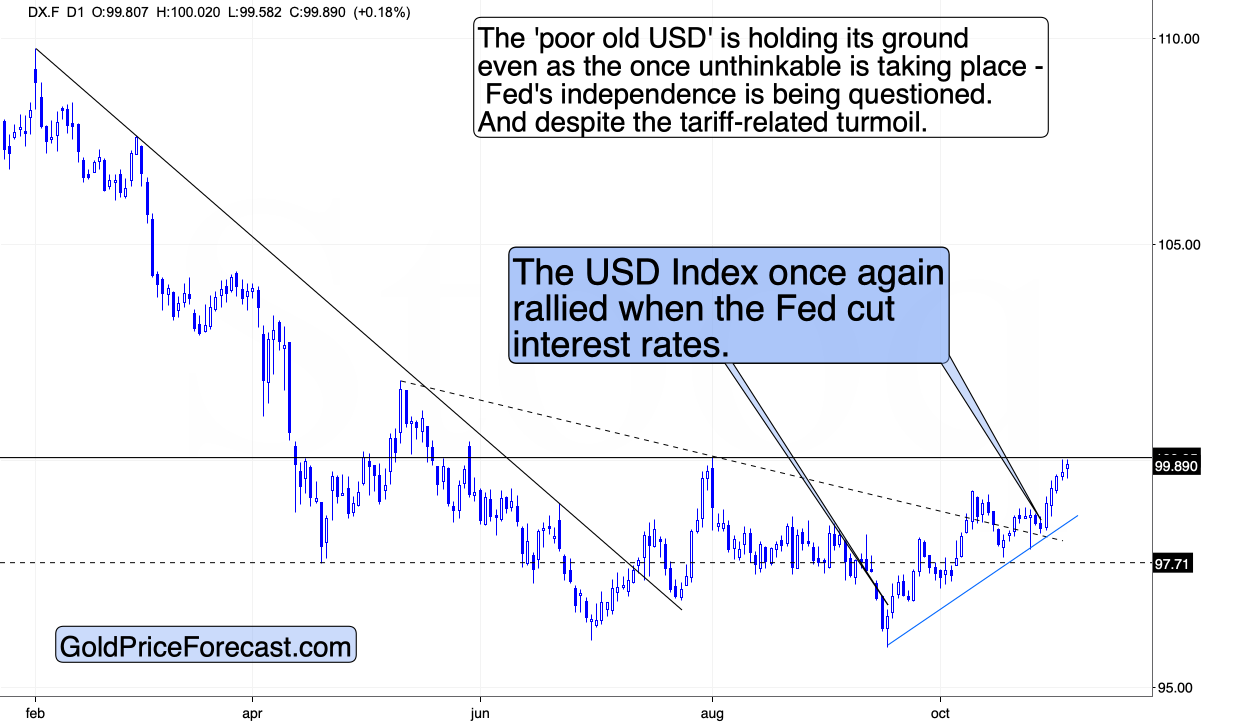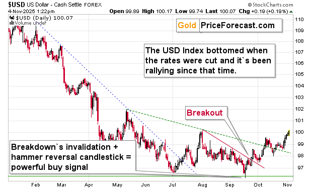 Still, once the USD Index’s rally becomes obvious, gold price is likely to tumble. I already wrote why gold price forecast for November 2025 was bearish previously, and what we see today simply confirms it.