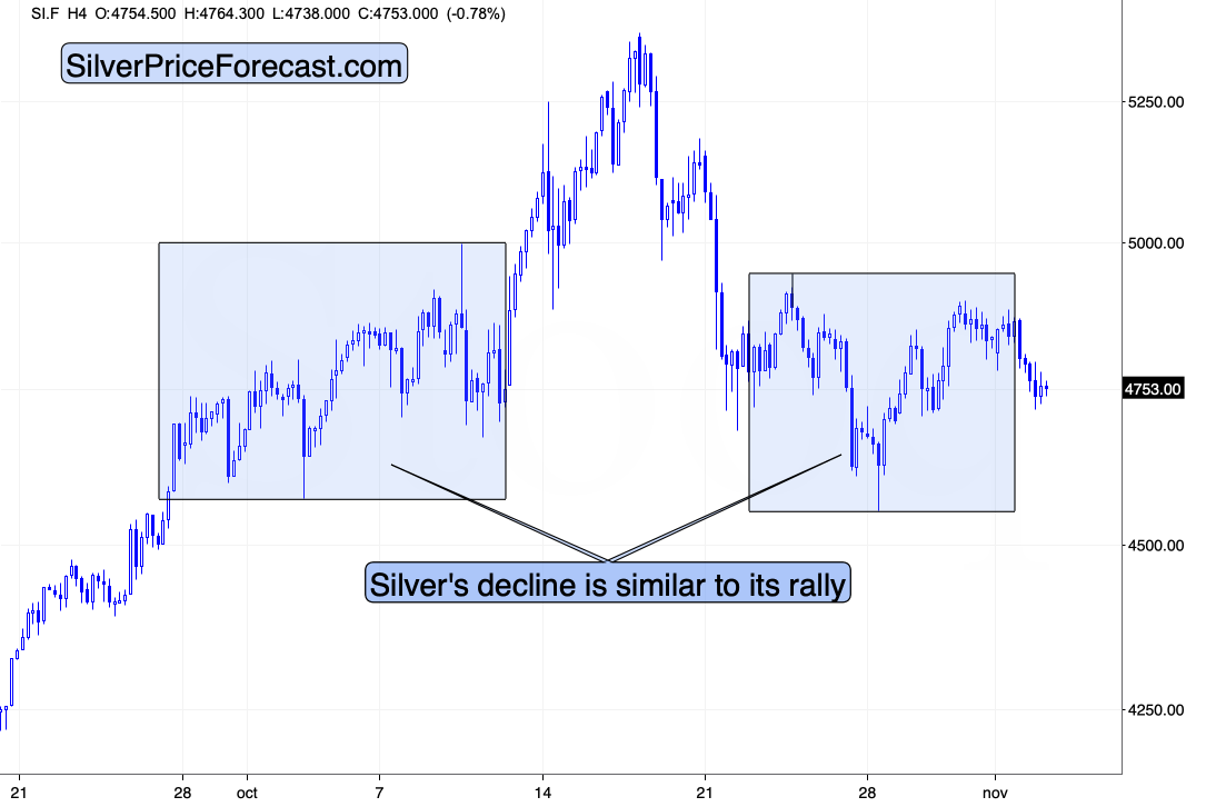 Silver is also correcting its recent decline, and it’s doing so in a way that’s creating a symmetrical pattern relative to how its price moved in early part of October.Â