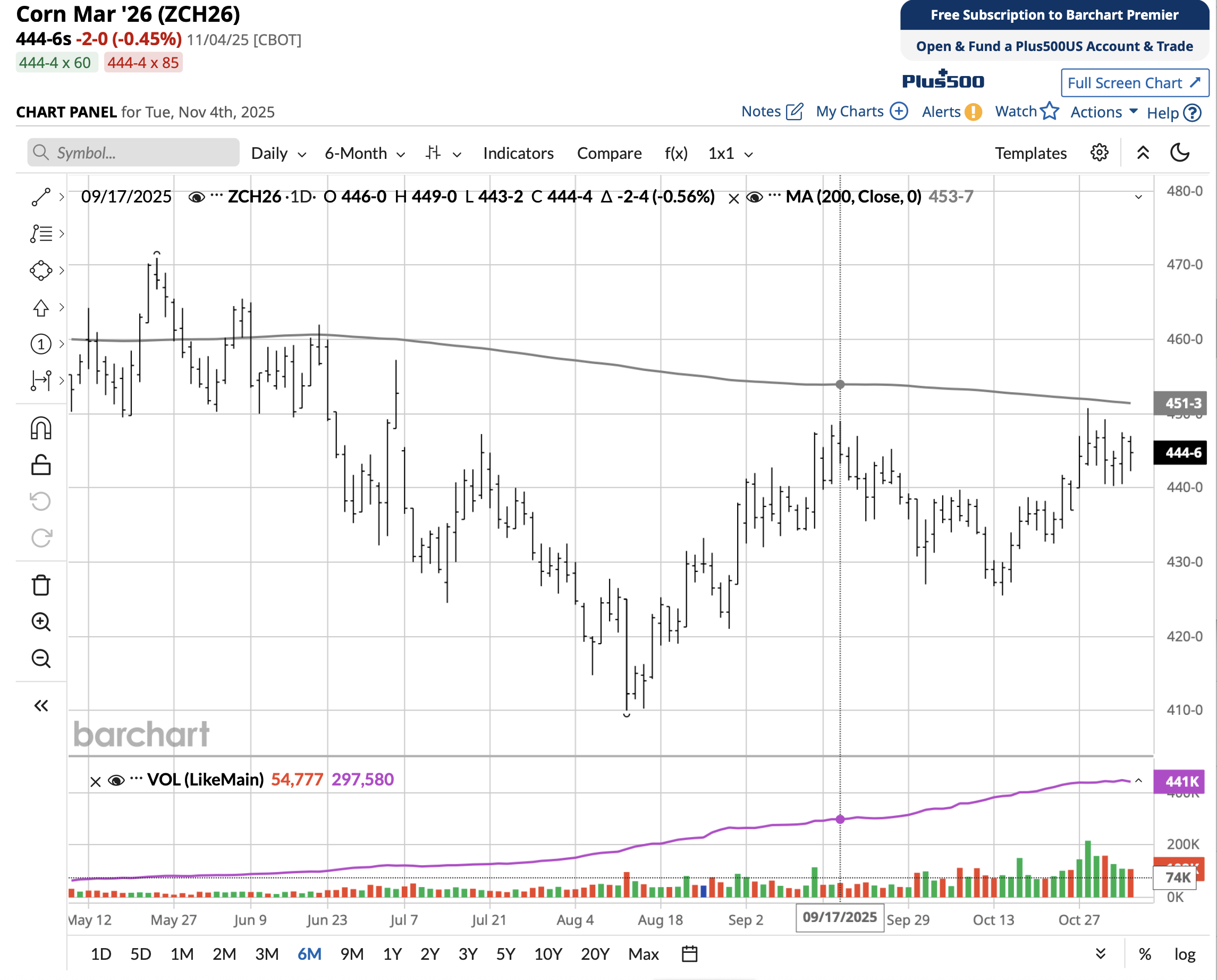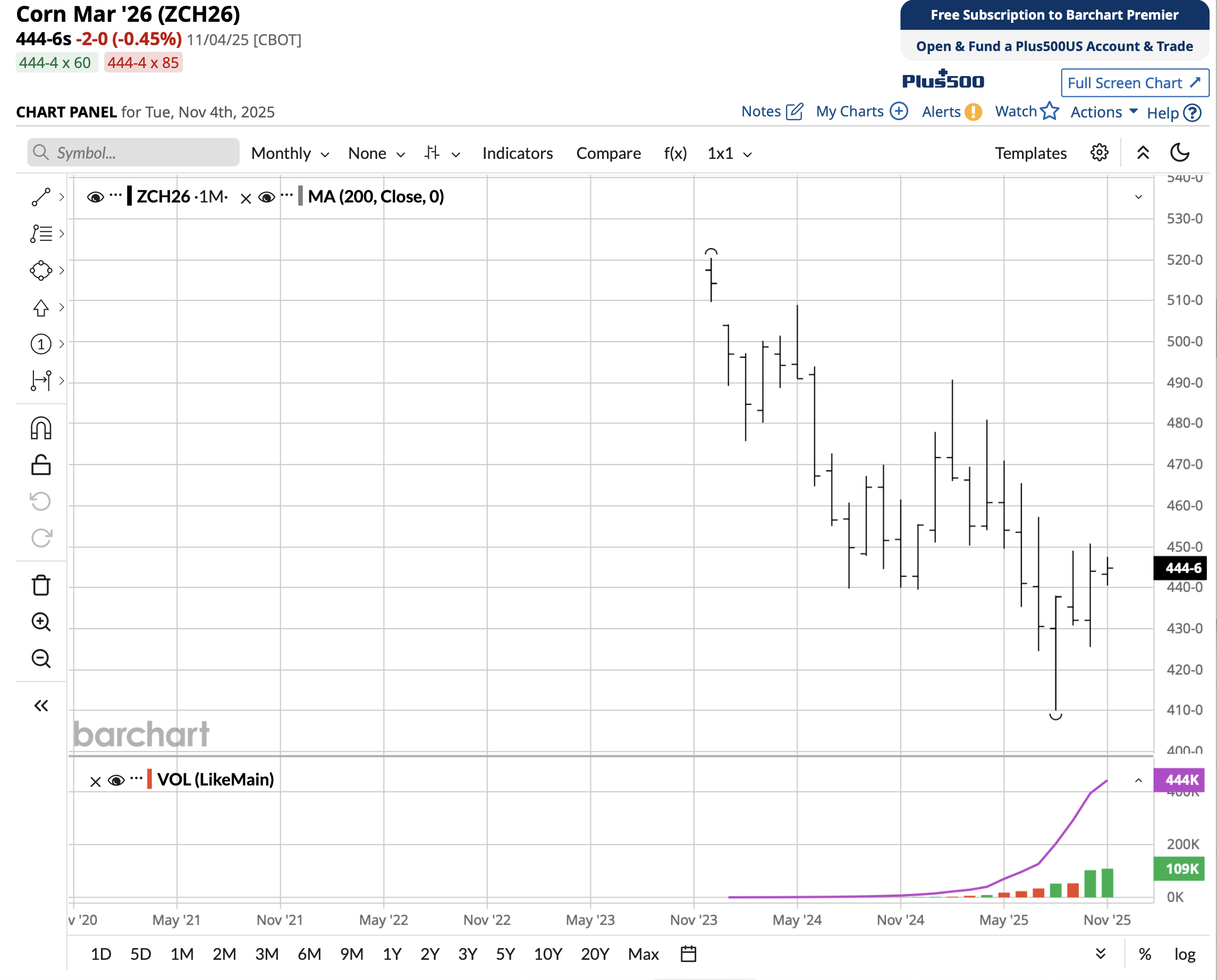 An option strategy is to sell three March 2026 corn 425 puts at 6½ ($975). With that premium in your account, buy one March 2026 corn 445 call at 14 ($700). Expiration on these options is February 20, 2026. In my opinion, we won't see March 2026 corn reach 425.