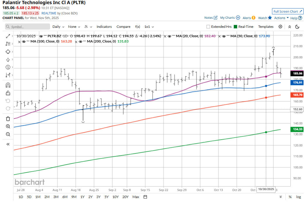 In fact, longer-dated options expiring mid-January also have the lower bound pegged at nearly $155, according to Barchart, suggesting Palantir shares could lose another 16% through the end of 2025.