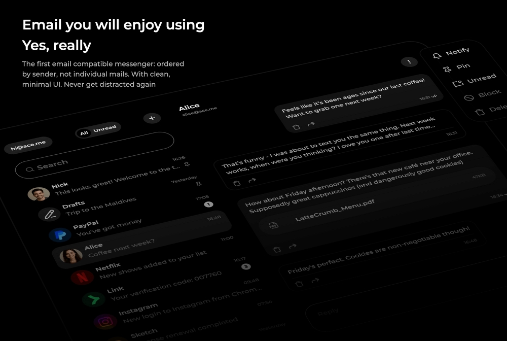 On the inbox side, ace.me describes an email-compatible messenger that orders messages by sender, offers near-instant search and includes read receipts and pinned messages. The design moves away from traditional threaded inboxes, aiming for a cleaner, messenger-like experience with strong spam and phishing protections and TLS encryption for all sent mail. For users who prioritize privacy and speed over the long, crowded email experience, ace.me’s offering presents itself as a viable email address alternative to mainstream providers.
