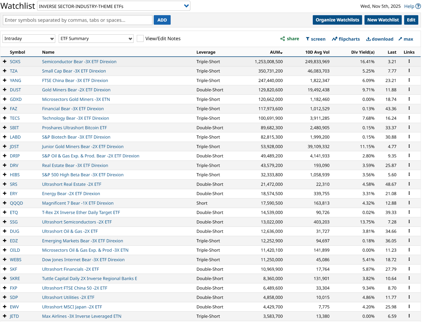 Yes, and here are just a small batch of them, from a watchlist I created and track closely. I’m a risk manager, and that means whenever I think something is likely to go down in price sharply, my first question is “can I profit from that using an inverse ETF?” Increasingly, the answer is yes.