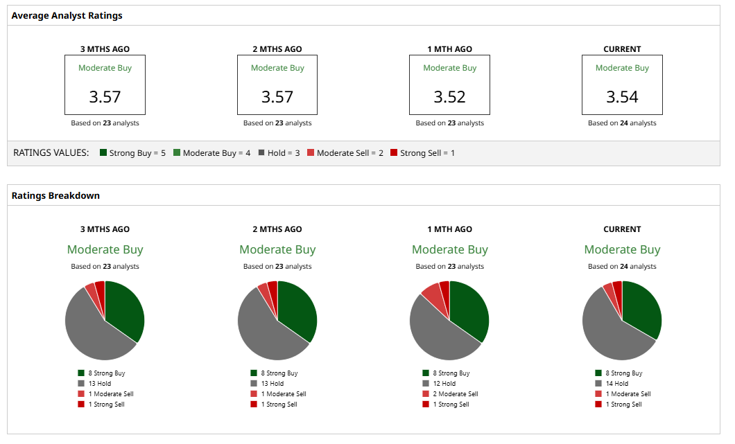 Overall, SHAK stock has a consensus “Moderate Buy” rating. Of the 24 analysts covering the stock, eight advise a “Strong Buy,” 14 analysts are on the sidelines with a “Hold” rating, one gives a “Moderate Sell,” and one suggests a “Strong Sell" rating.