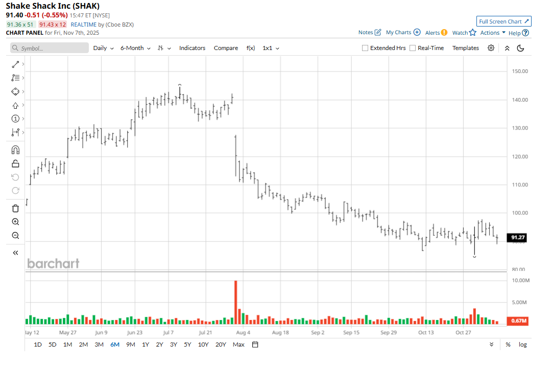 On a year-to-date (YTD) basis, the drawdown is even more substantial, with shares down 29%. Over the past year, SHAK is down by 30%.