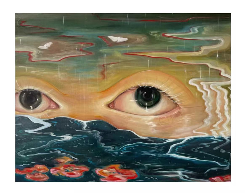 Emma June Jones, a painter from Chicago now based in New York, contributes Past the Horizon (2025), an oil-on-canvas work that fuses dreamlike figuration with psychological intensity. A graduate of the Savannah College of Art and Design, Jones often situates bodies and landscapes in fluid, shifting environments. In this painting, eyes emerge from the water’s surface beneath streaks of rain, merging human perception with the natural world. The composition reflects her ongoing exploration of identity, vulnerability, and transformation through surreal imagery and saturated color.