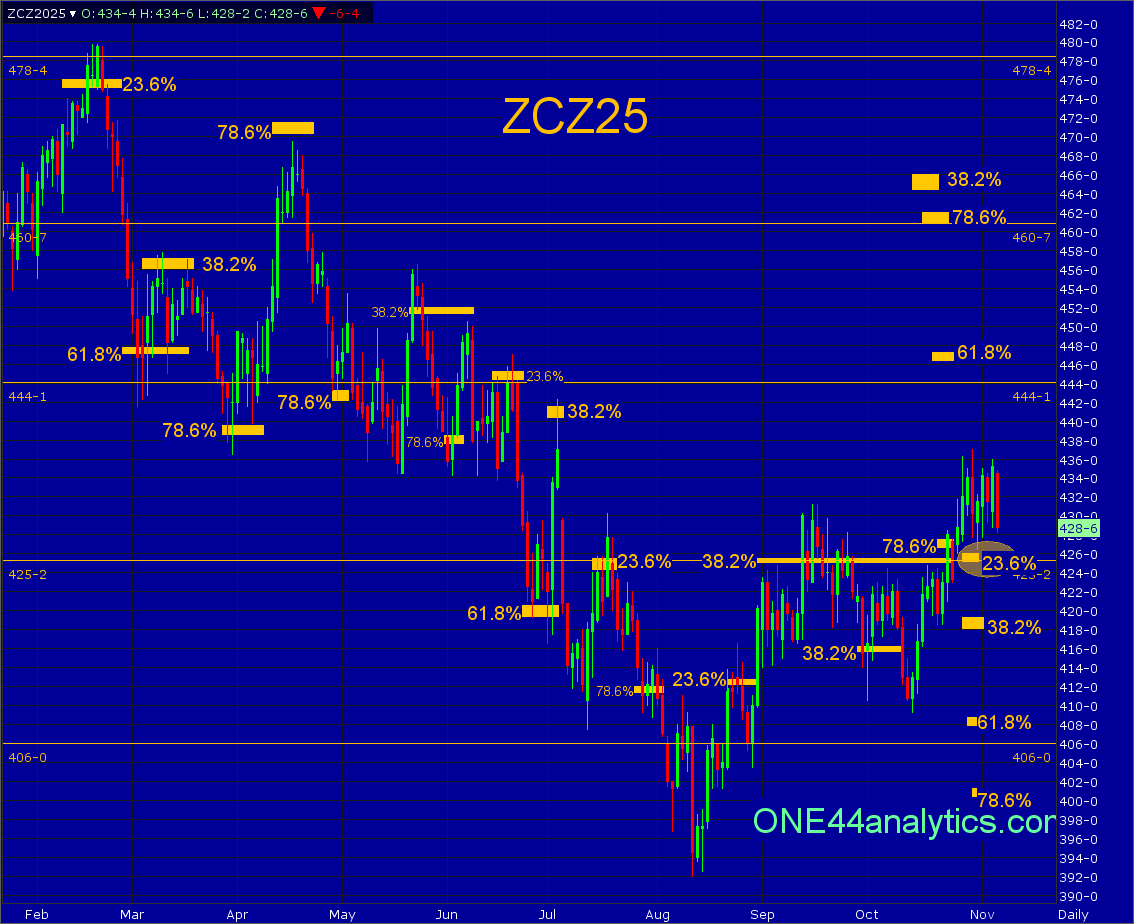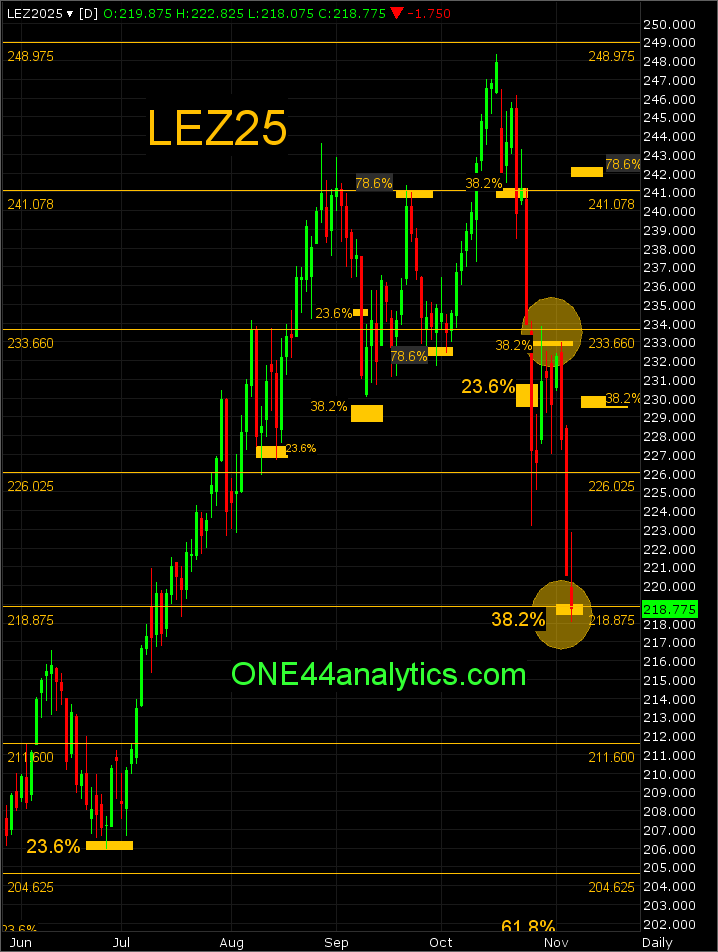 In Cattle the year long rally held 23.6%, or 38.2% on every setback until the high on 10/16/25. It then fail to hold retracements below, the first sign of a trend change and then this week the high hit 38.2% back to that high at 232.85, what followed is a $12.00 break so far.Â