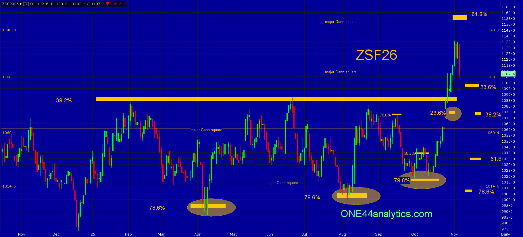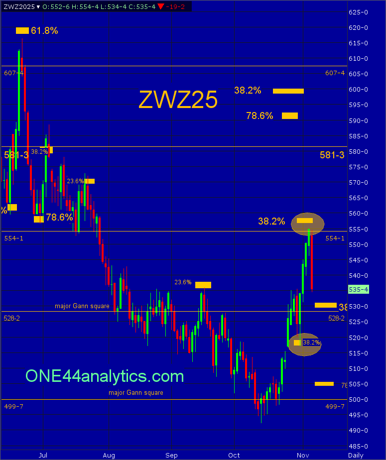 For Wheat the low for the week held 38.2% back to the 10/14/25 at 519.00, holding this level was the first sign the short term has changed and it has rallied 35 cents at this point and hit our short term target area of the 554.00 major Gann square and 38.2% back to the 2/19/25 high at 557.00.Â
