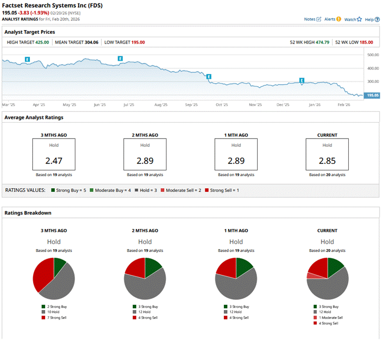 Among the 20 analysts covering FDS stock, the consensus is a “Hold.” That’s based on three “Strong Buy” ratings, 12 “Holds,” one “Moderate Sell,” and four “Strong Sells”.