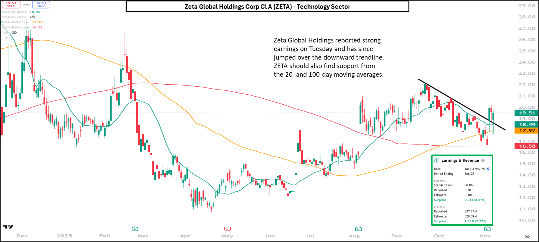 Zeta Global Holdings reported strong earnings on Tuesday and has since jumped over the downward trendline. ZETA should also find support from the 20- and 100-day moving averages.